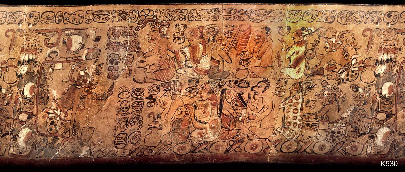 Musicians emerging from a deified cave (left, looking like a great mouth). The ruler is being welcomed on his throne.