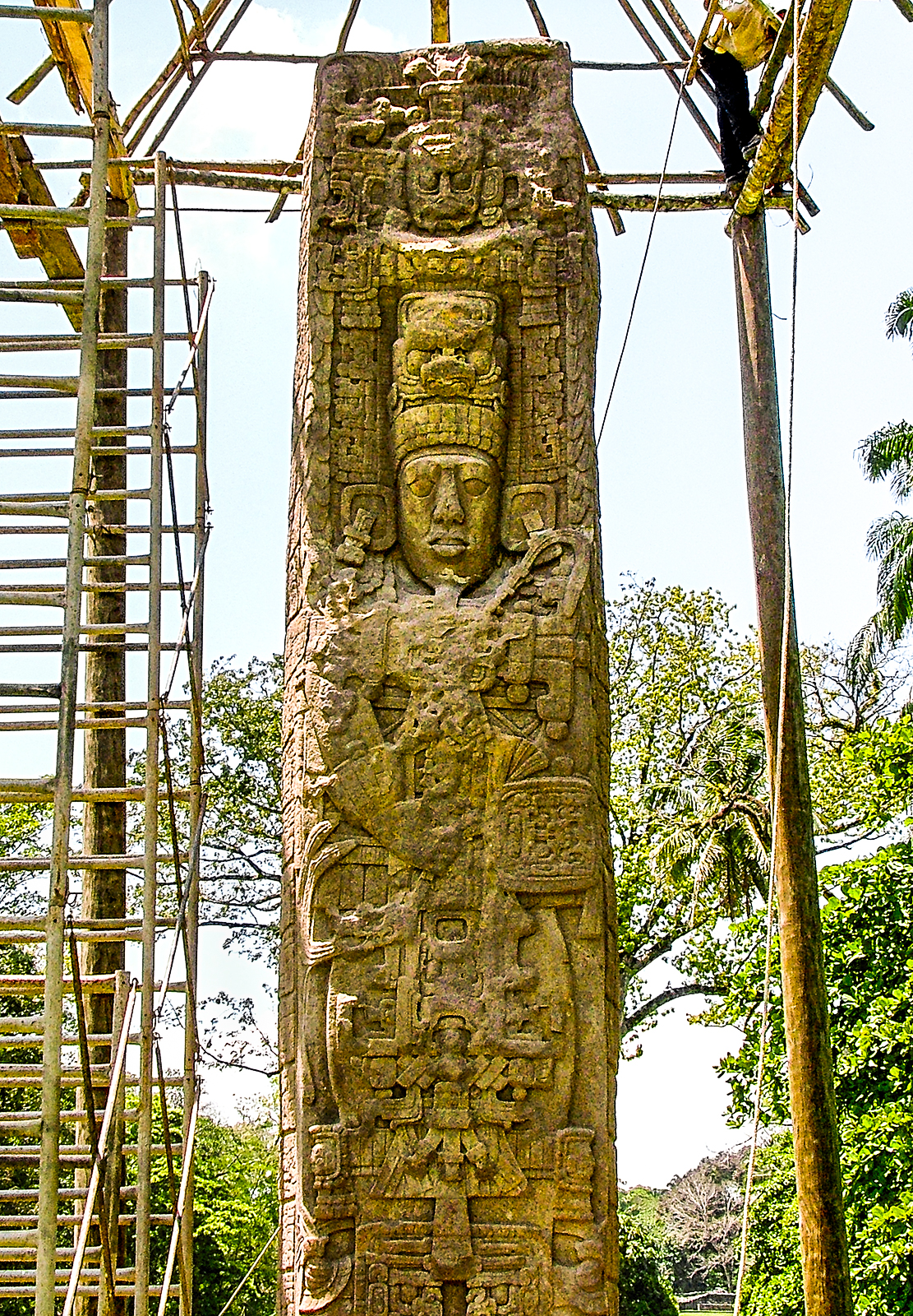 Maya stelae are tall stone monuments, erected in the Classic Period between 100 and 300 AD. Many of them were sculpted in low relief on all four sides with kings, gods, ancestors and hieroglyphs. They were mostly painted red—the color of the life force—but uncarved stelae were also found. It’s speculated that these had been painted with images and glyphs.