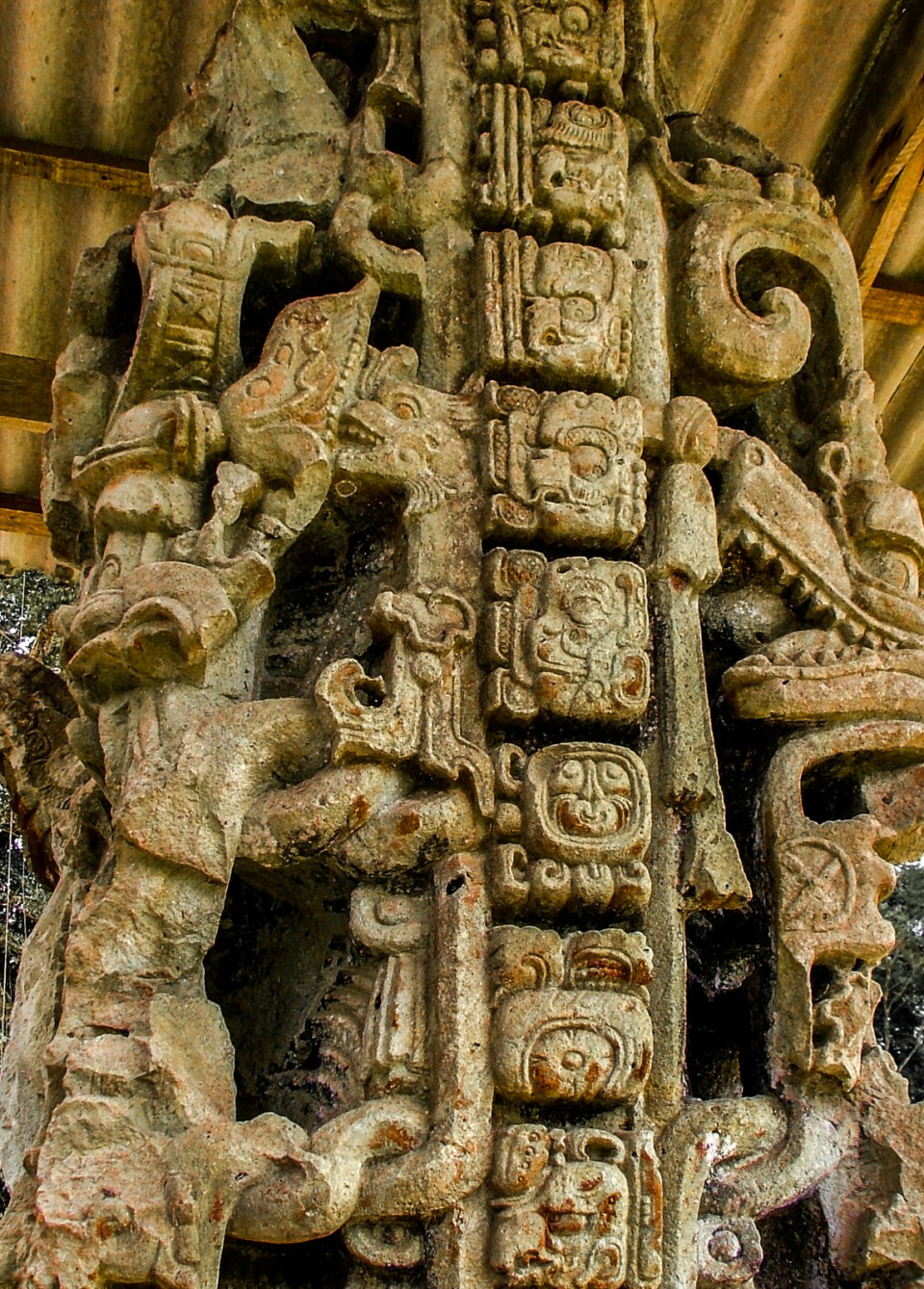 The likeness of kings, their associations with various deities, ritual performances and other exploits were featured on the stelae because they personified the gods being celebrated. Over time, through ritual, the cycles prompted the repetition of mythological and historical events. And physically, applying an agricultural metaphor in the inscriptions, the Period Ending monuments were “wrapped” in a cloth shroud and “planted” in the ground in the manner of a farmer planting maize seeds. At its dedication, the shroud was removed, and like the shucking of an ear of maize, the “kernel” of the event was revealed. There are also references to stelae being “tied” in bands of cloth in the manner of kings being “tied” in a white headband, the symbol of rulership.